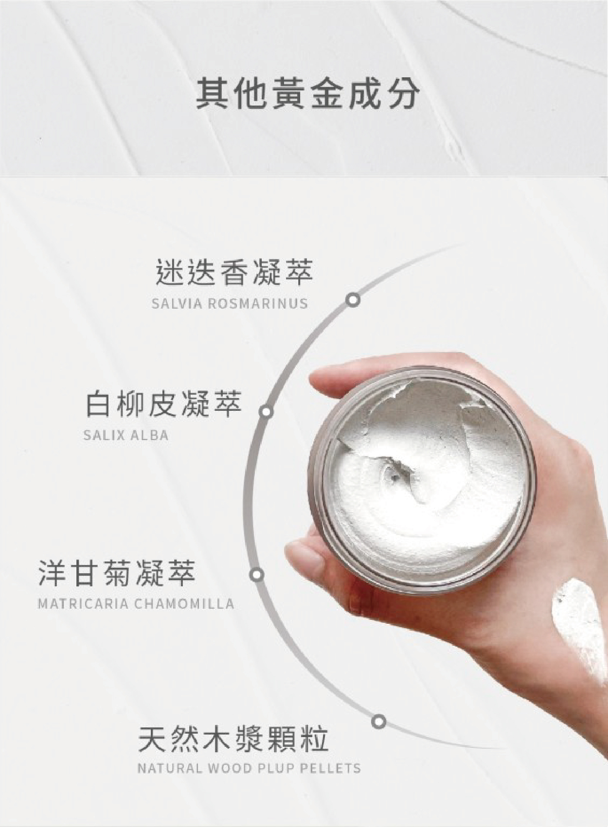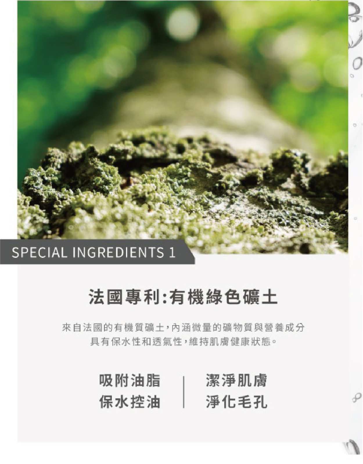 主要成分 : 有機法國綠色礦土/金縷梅萃取液/迷迭香萃取/白柳樹皮萃取/有機洋甘菊萃取/天然木漿顆粒