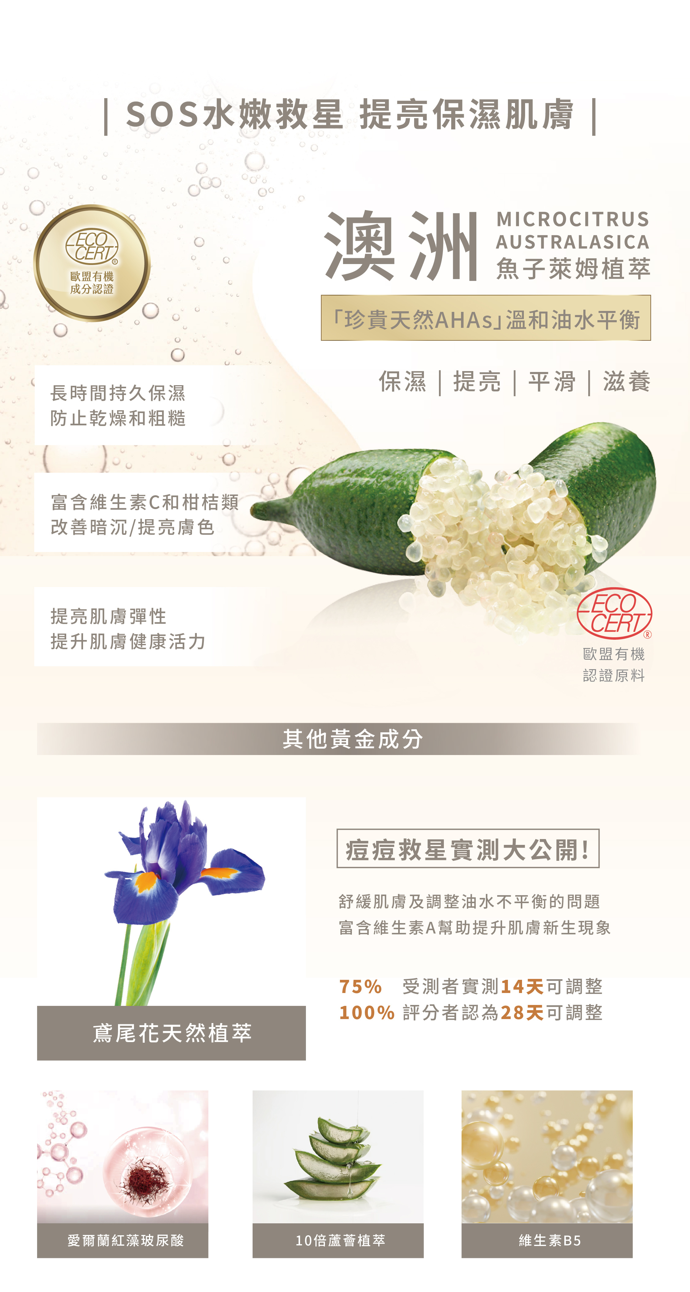 主要成分 : 玻尿酸/愛爾蘭紅藻玻尿酸/澳洲魚子萊姆植萃/鳶尾花萃取/蘆薈萃取液/維生素B5