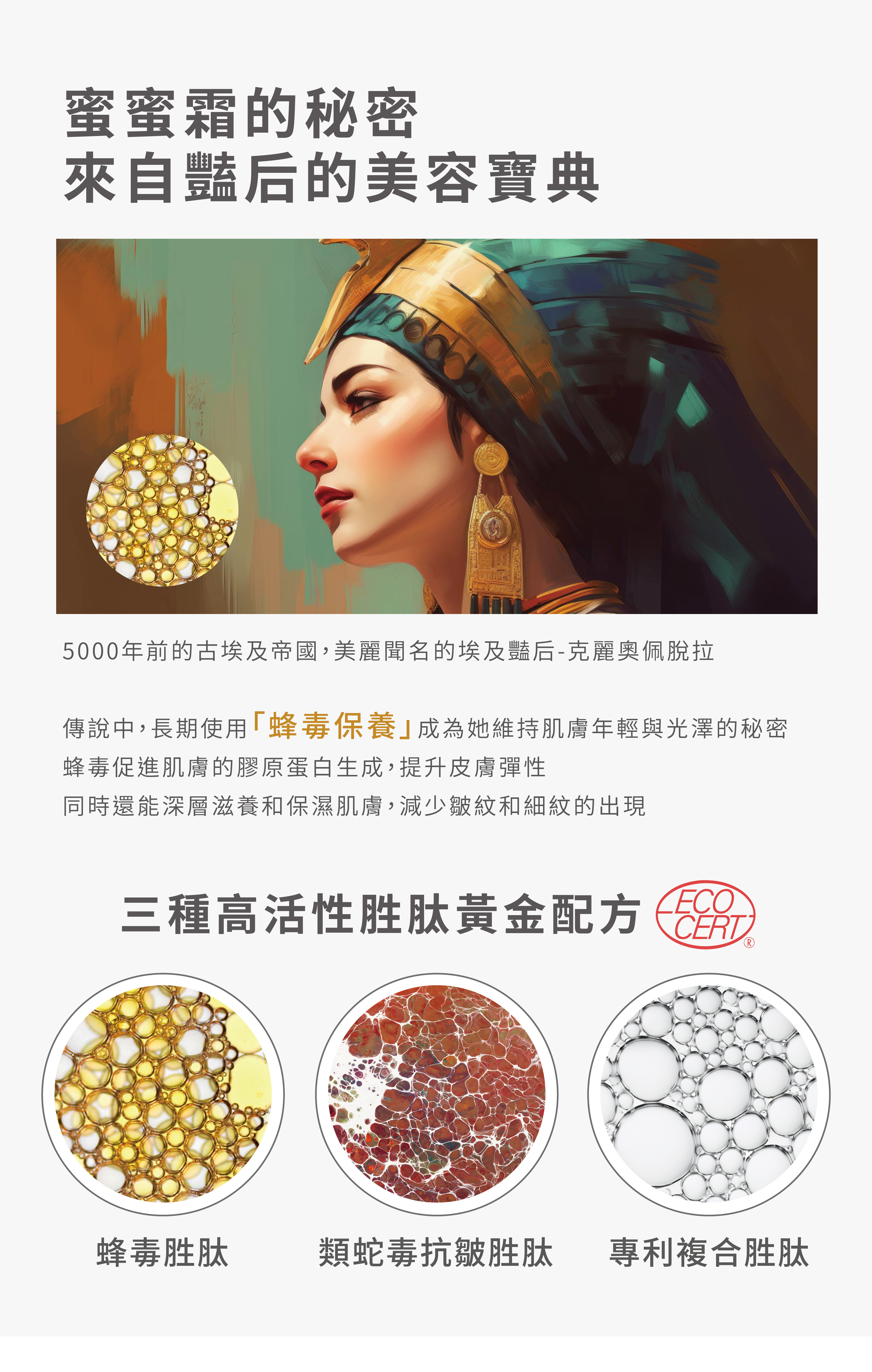 主要成分 : 蜂毒胜肽/類蛇毒抗皺胜肽(SYN-AKE)/專利複合胜肽(SYN-TC)/玻尿酸撫紋因子/草本植物舒緩精粹/植物性角鯊烷/天然維生素E