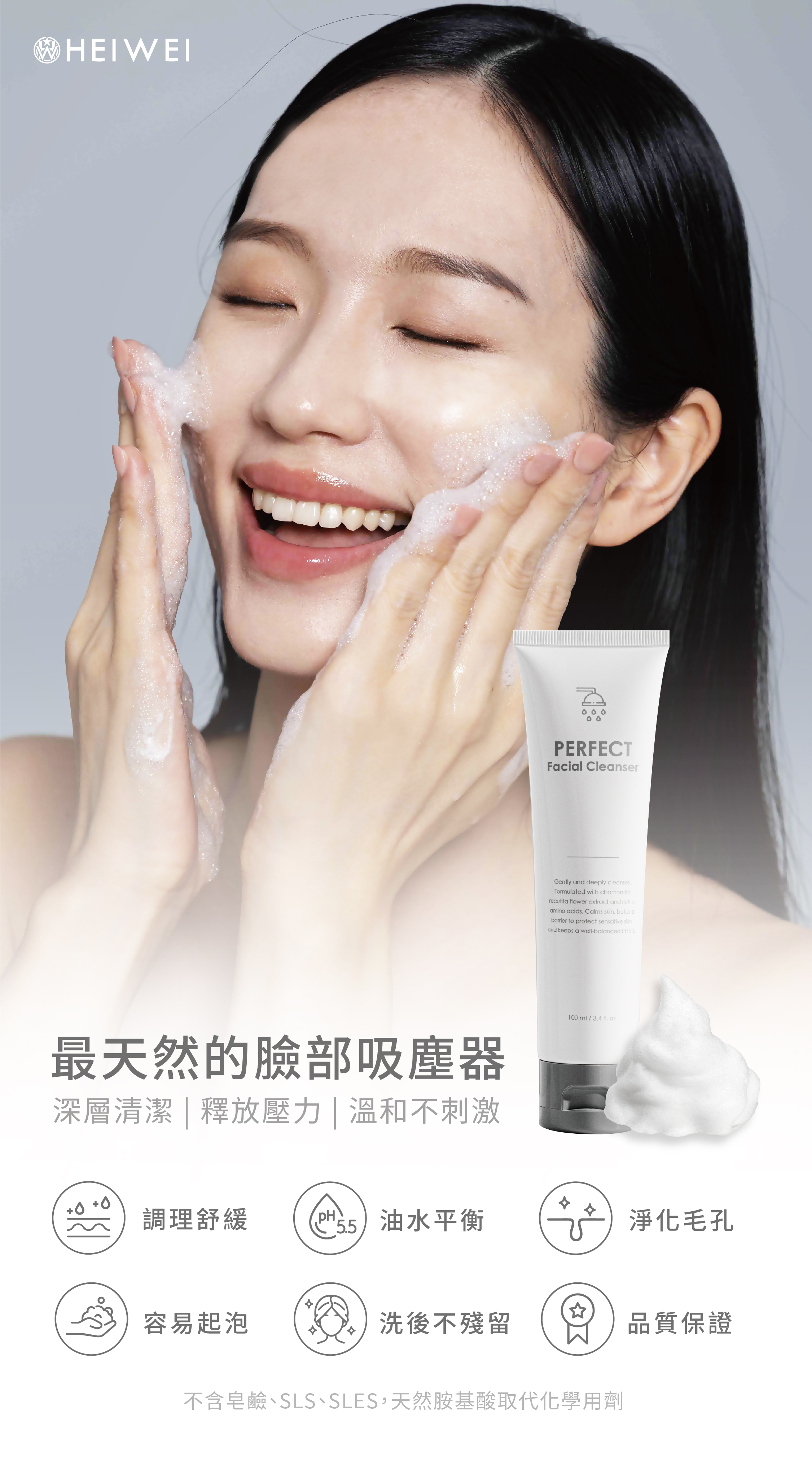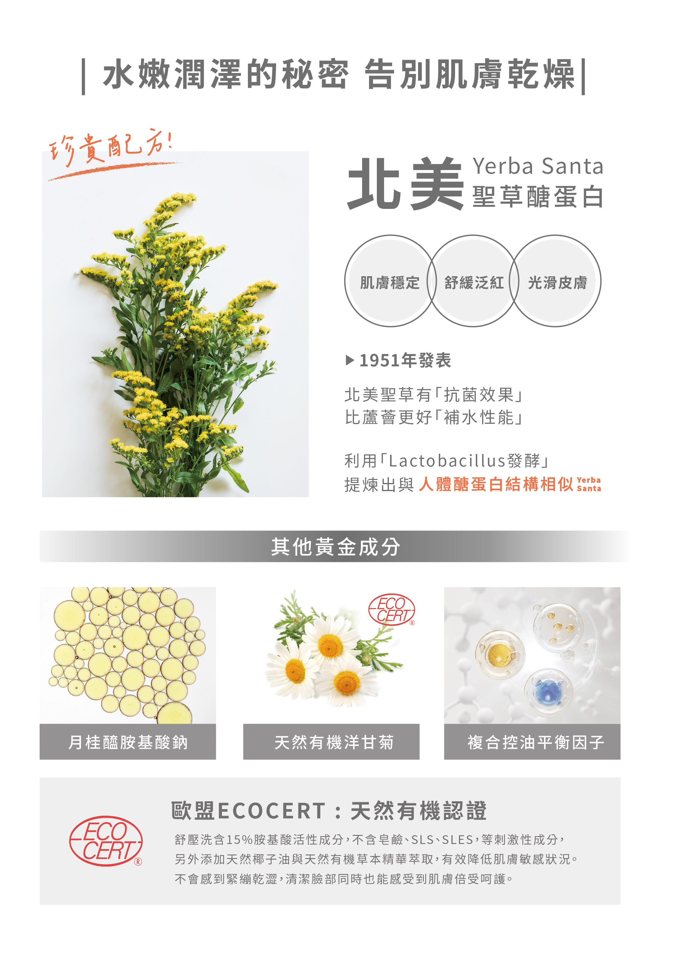 主要成分 : 月桂醯胺基酸鈉/陰離子胺基酸起泡劑/椰油醯羥乙磺酸鈉/有機洋甘菊萃取液/北美聖草醣蛋白/控油調理平衡因子